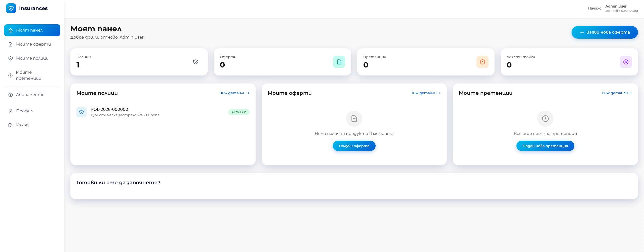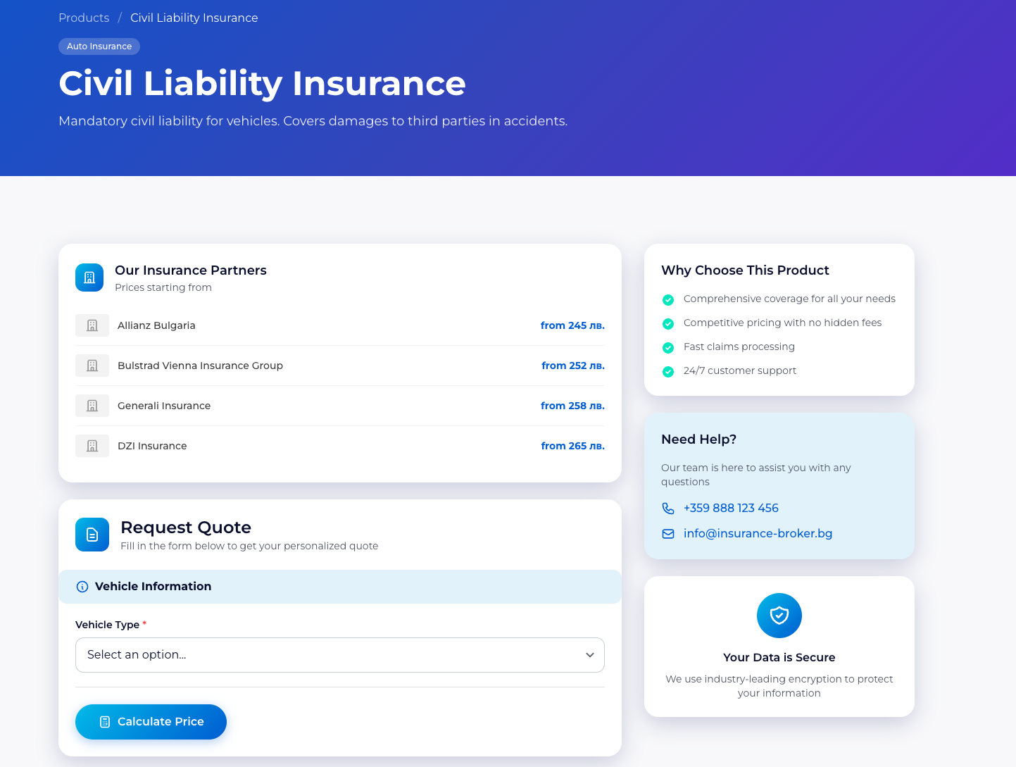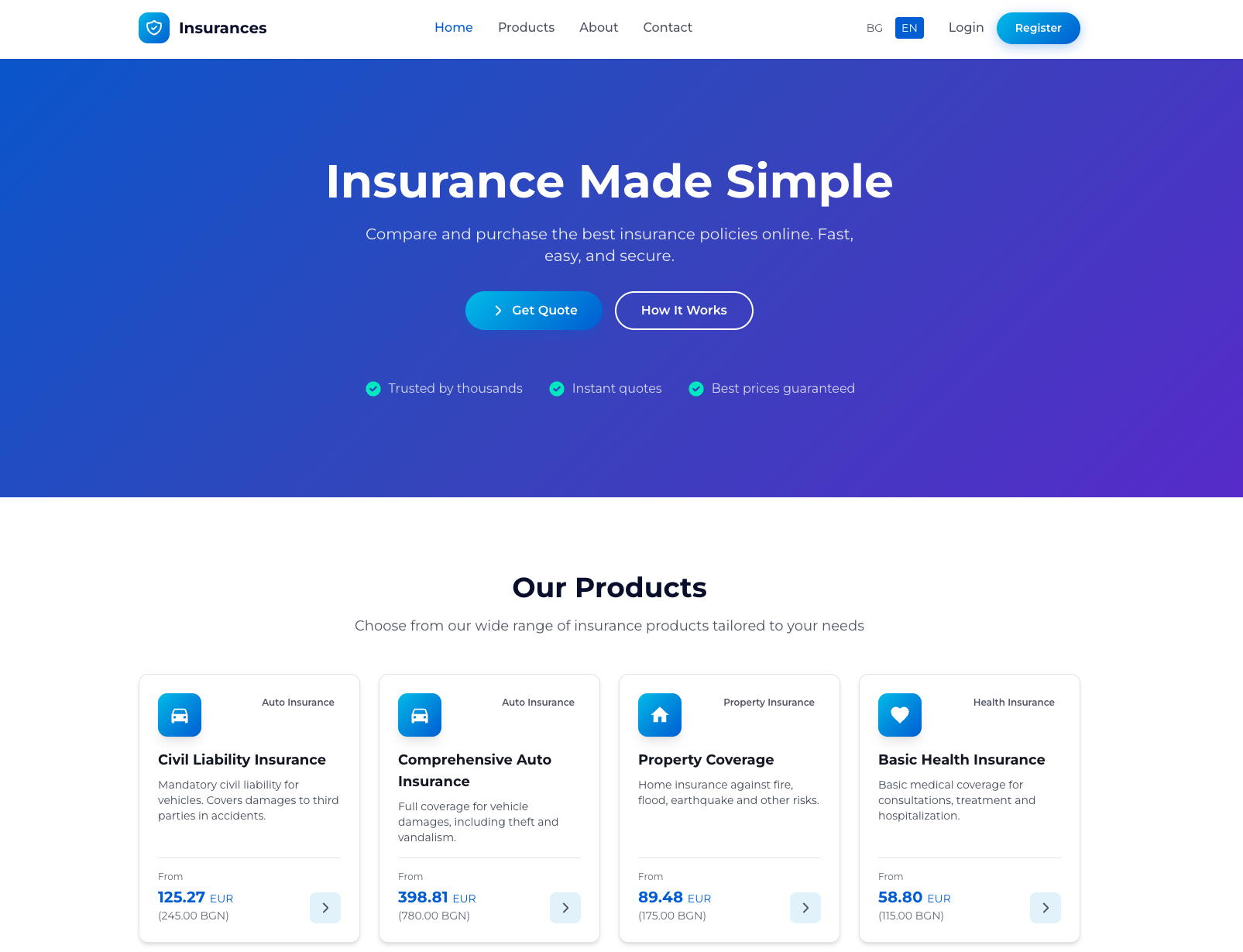 On the public insurance site, that complexity already shows up in practical ways. There are multiple insurance product types, including car insurance, casco, property insurance, health insurance, and travel insurance, each with its own pricing and positioning. The site also supports Bulgarian and English language switching, customer login and registration, and a homepage optimized around trust, speed, and simple conversion. (insurance.devco.solutions)